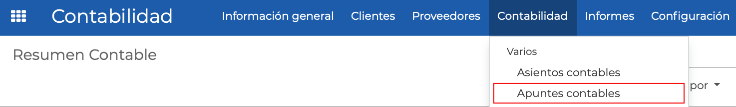Al finalizar el mes, o cuando se desee conocer todos los adelantos realizados y registrados en Kanban ERP en un período de tiempo determinado, se podrá acceder la opción de menú Contabilidad y de la lista desplegable seleccionamos la opción Apuntes contables: