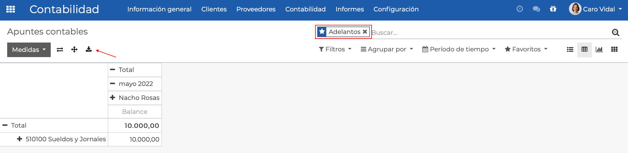 Luego, seleccionamos el filtro Adelantos y finalmente hacemos clic en el botón Exportar: